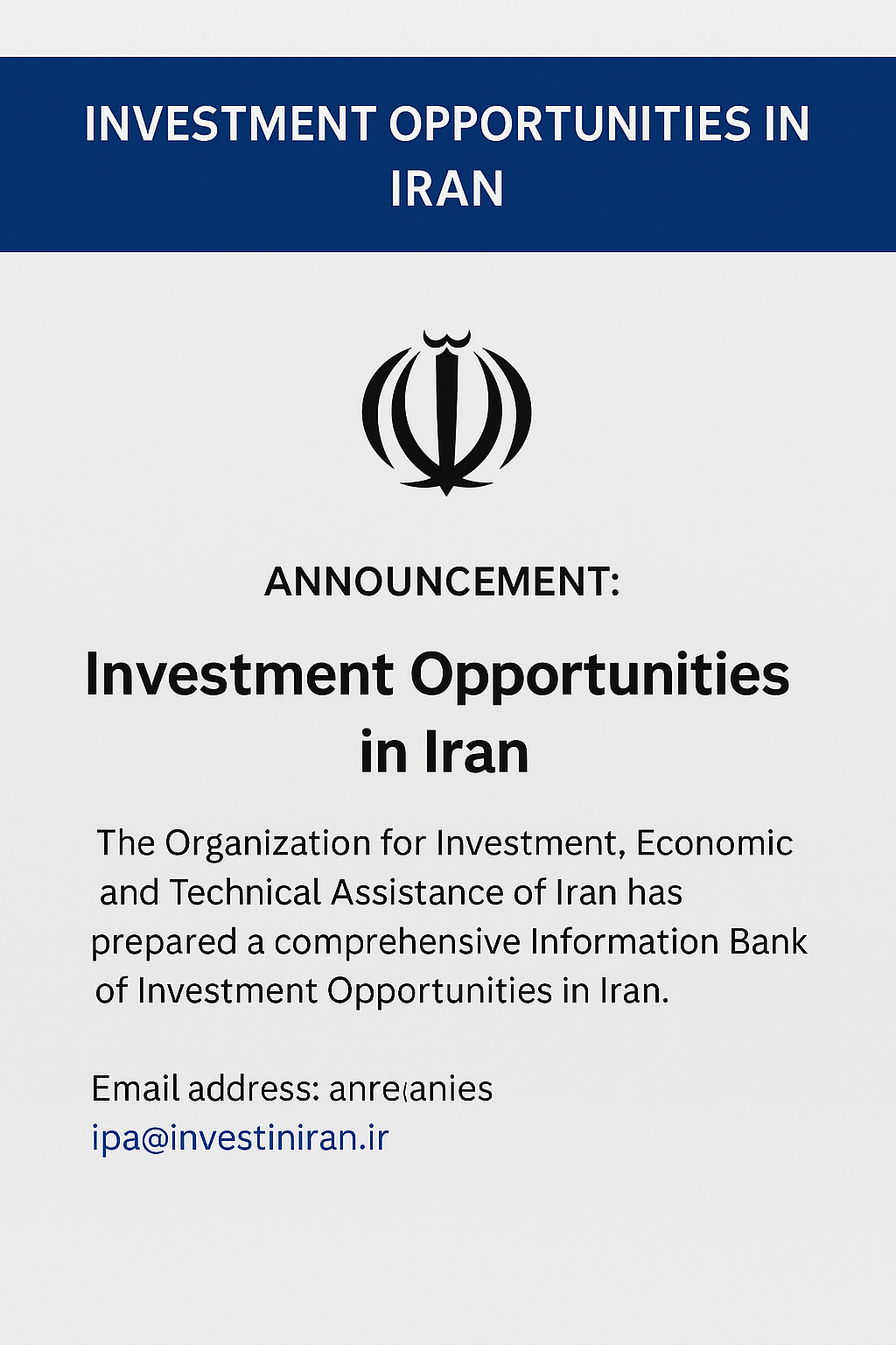 The Organization for Investment, Economic and Technical Assistance of Iran (OIETAI), as the national authority responsible for promoting and supporting foreign investment, has prepared a comprehensive Information Bank of Investment Opportunities in Iran. This resource presents diverse opportunities across multiple sectors, designed to welcome and guide foreign investors interested in engaging with Iran’s growing economy.